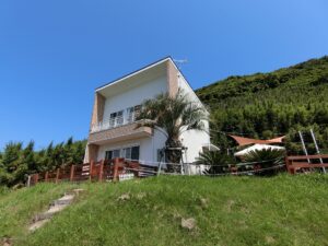 物件建物は、場面によって2組でも宿泊できるよう1階と2階がセパレートできるように設計された貸別荘タイプの間取りとなるが、個人の別荘利用でも何ら困ることはない。ただキッチンやバスルームは2箇所いらないというのであれば、そこは多少工夫してリフォームを施してほしい。高台立地のため、もちろん1・2階共々海のロケーションは素晴らしいが、特に2階南西側角のロケーションは海がワイドに見える絶景である。また、この建物をそのまま貸別荘として継承したいという方は、ノウハウやその他、諸々のことを引き継ぐオーナーチェンジとしても購入可能である。