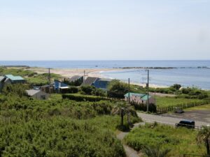 今回ご紹介する物件は、その白浜根本の海を高台からパノラマ状に望むことができる別荘となります。「海を望む」とひとえに言ってもシュチュエーションや見え方など様々ではあるが、私個人としては、この程々の高さから眺める海景色は非常に好きである。海から届く潮騒や潮の香をダイレクトに感じられる海との距離感。丸く横に広がった海は開放感に溢れ、ただ眺めているだけで爽快な気分に浸ることができる。水平線の輪郭には伊豆諸島の大島や、海外から何を運んできたのだろうか大型船の姿がアクセントとなる。そんな光景が日常となり、その贅沢な環境で過ごすスローライフがここ南房総の海時間である。