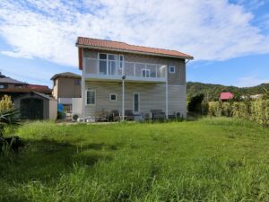 本物件は別荘地の入口付近、高台のふもとにある区画のため、先ほどご紹介したような迫力ある眺望こそ得られませんが、注目していただきたいのは、140坪というゆとりある敷地と、そこに建つ魅力的な住まい。建物は大手ハウスメーカー・セキスイハイム施工によるもので、落ち着いた雰囲気をまとったお洒落な佇まいが特徴的。広い庭では菜園やガーデニングなどの庭遊び、またドッグランとしても活用でき、別荘としてだけではなく、移住や二地域拠点の用途としても検討できそうです。