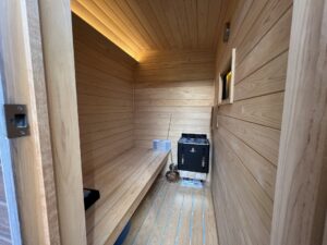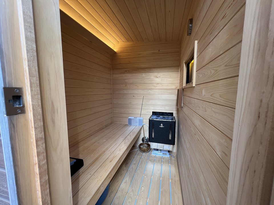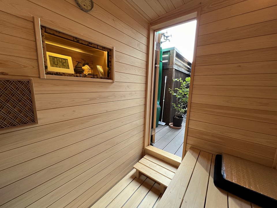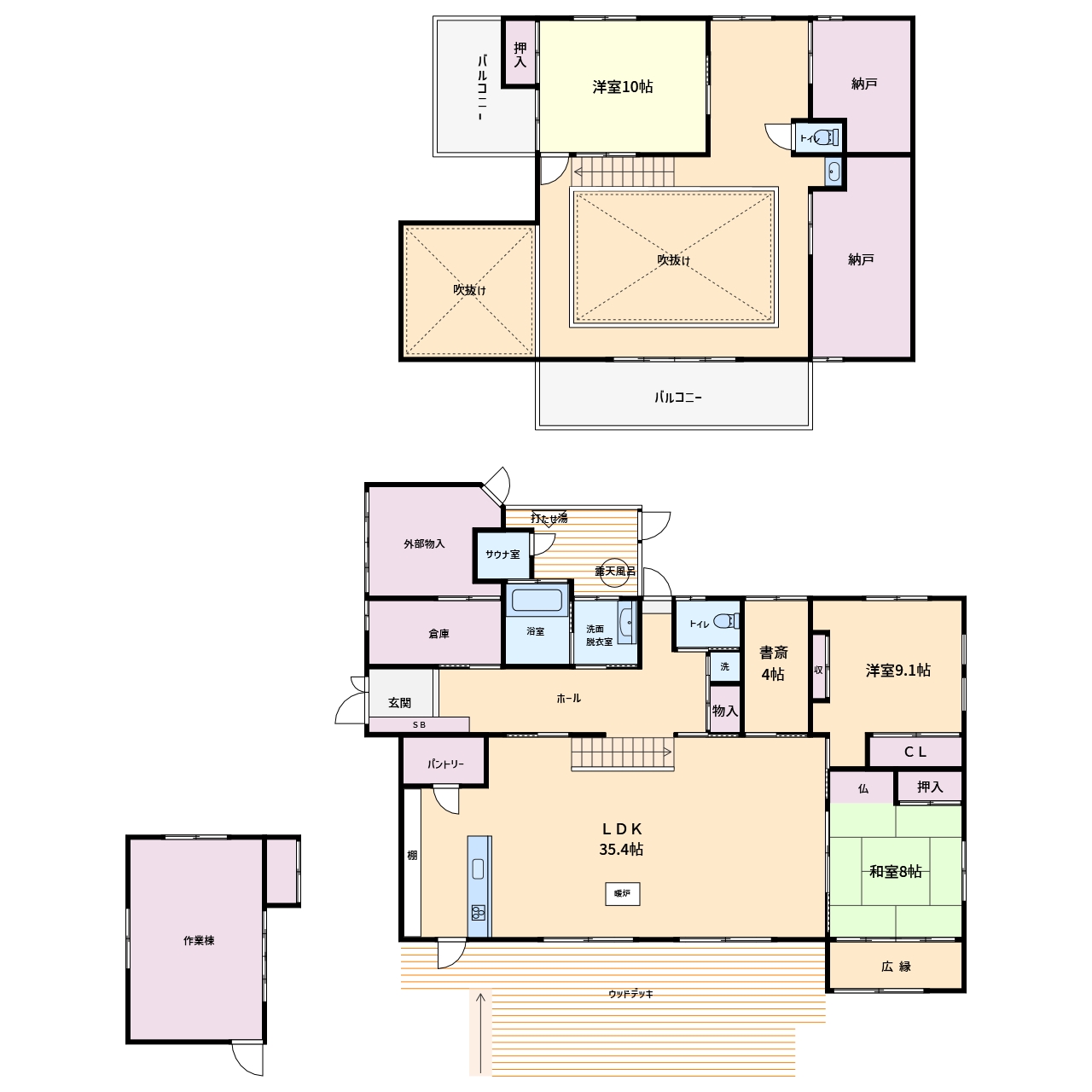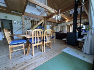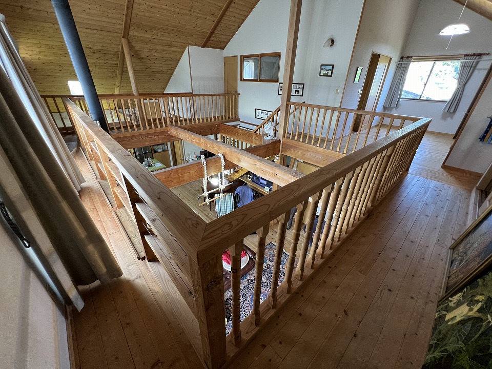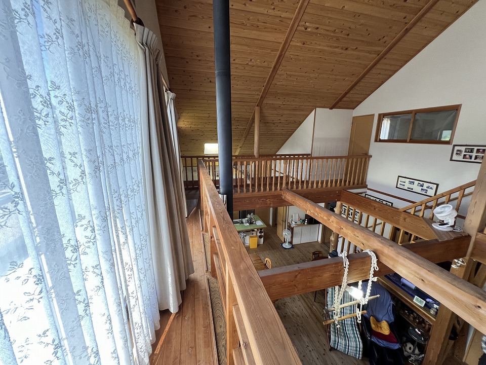 建物については、延床63坪(4SSLDKその他)といった“かなり”が付くほどのスケールをもつ大型邸宅。木の温もりが優しい室内は、玄関に足を踏み入れた時から『この家、すごそうだな……』と思わせるような雰囲気が漂い、リビングに入った瞬間に「やっぱりすげーわ……」とその印象を確信させられる。35.4帖の広いLDKは、ご自慢の庭を一望できるワイドな採光が空間全体の開放感を演出。さらに、吹抜けになっている天井部は、その周りを回廊のように歩くことができる贅沢な構造となっている。また、リビングの東側には和室とベッドルーム、書斎までを配置。洗面ルームからはオーナーさまが造作した『露天風呂』や『打たせ湯』、『サウナ』コーナーへとつながり、思わず笑みがこぼれてしまうような、至福のひとときが味わえてしまう。