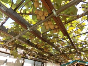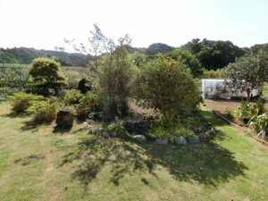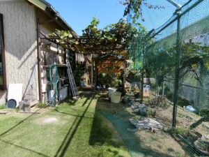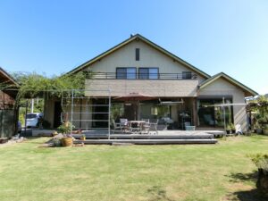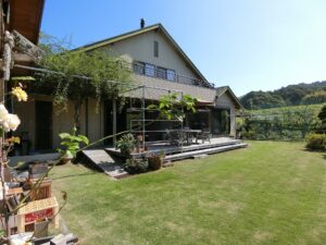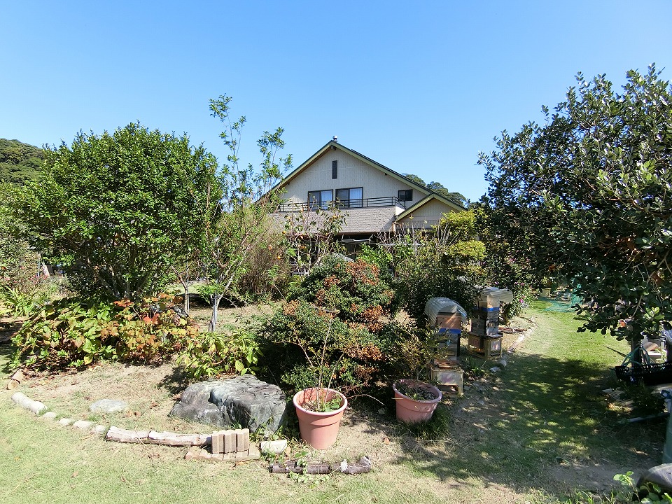 今回ご紹介する物件は、そんな長閑で落ち着いた環境に佇み、大きな三角屋根が印象的なお宅となります。四方には程よい距離感で里山が広がり、青く澄んだ空とのコントラストが爽やかなロケーション。現オーナーさまが十数年前、この地を移住先として『ここだ!』と即決されたというエピソードも頷ける、まさに田舎暮らしに適した和やかな風土が広がっている。260坪の広々した敷地には、田舎暮らしの醍醐味である菜園スペースはもちろん、キウイフルーツやフェイジョア、柿、桃、梅、イチジク、ブドウ、ミカンと、まるで果物屋のような果樹のラインナップ。さらに、薔薇や金木犀など多彩な植樹が彩りを添え、日本ミツバチまで飼育しているというのだから驚きである。これぞ「田舎暮らしの教科書」と呼びたくなるような、理想の暮らしがここでは待っています。