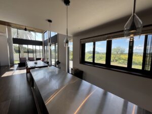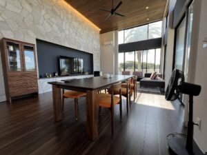 玄関ポーチからリビングの壁まで乱形石で仕上げられた建物は、リゾート感たっぷりで、これぞ“別荘”といった雰囲気を醸しだしています。室内に足を踏み入れると、目の前にはプロ仕様のキッチンセットが揃っており、地元館山の新鮮な魚介や採れたての食材を使って、仲間と語らい料理を楽しむのも、この場所ならではの楽しみかもしれません。そのキッチンと一体になっているLDKは約30帖の広さ。リビングスペースにおいては、天井高がしっかりと確保され、さらに東西に設けられている大きな窓とが相まって柔らかな光を取り入れ、圧倒的な開放感に包まれながら快適に過ごすことができます。
