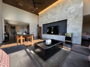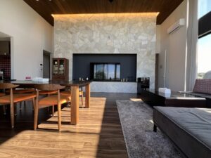 - 続いて乱形石の壁に存在感があるリビングスペースへ