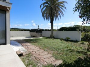 建物へと続くアプローチには、南米のビーチリゾートを思わせてくれるような植栽が配され、非日常としての雰囲気を演出。敷地は228坪と広々しており、外での時間を存分に楽しめる大きなウッドデッキと広い庭が備えられ、アウトドアを好む方や、愛犬と一緒にゆっくり過ごしたい方々にも、心地良い空間となることだろう。さらに敷地の東側にはサウナも完備されており、時間を気にすることなく大自然の中で心身を『ととのえる』、そんなひとときも、ここならではの楽しみとなるのではないでしょうか。