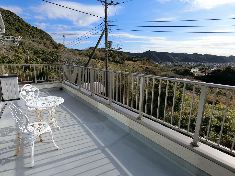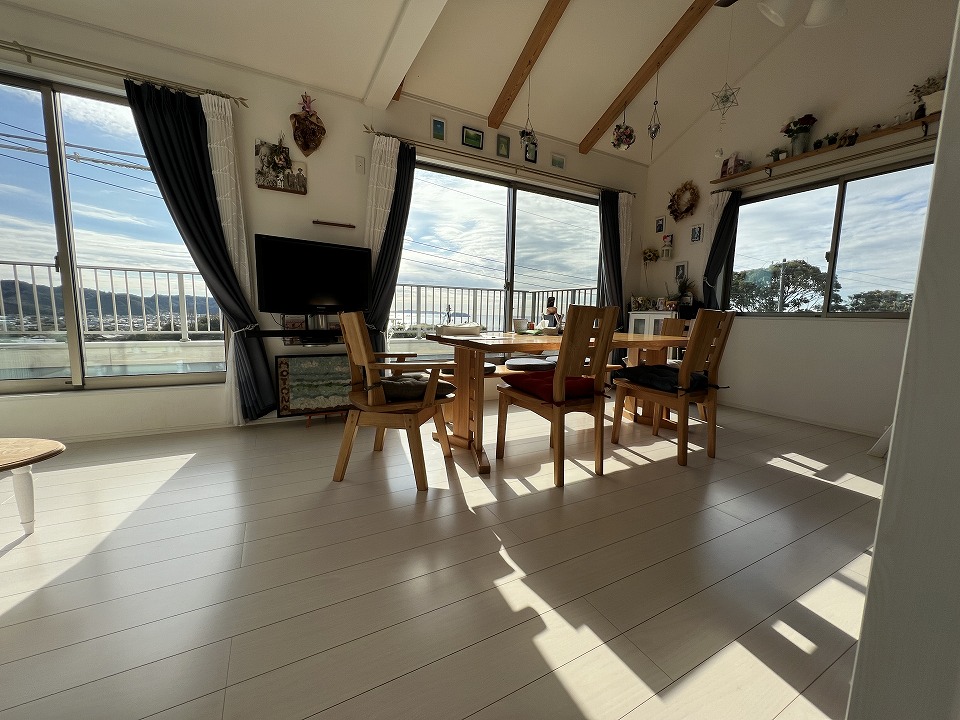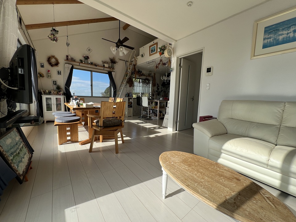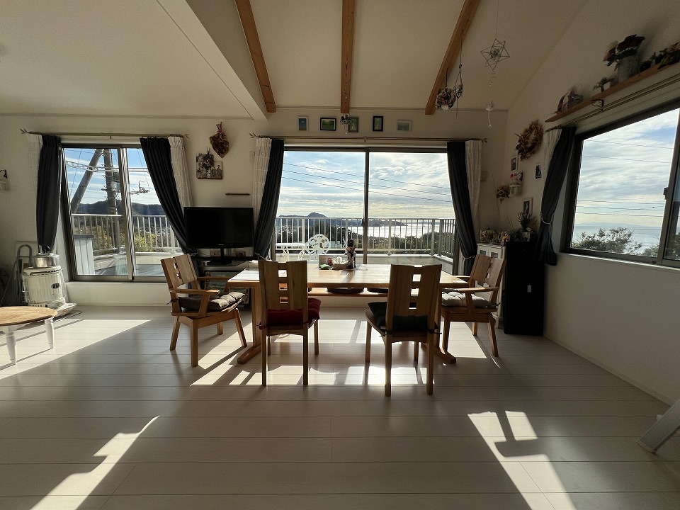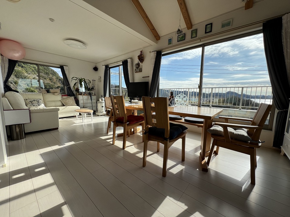 そんな景色を独占するかのように佇む建物は、平成29年5月に新築されたどこか愛らしさを感じさせる外観。オーナーさまのこだわりにより淡色でまとめられた室内は、1階に大地(緑)、2階に海(青)を、それぞれイメージしたカーテンなどが設えられており、フロアごとに異なる表情を楽しめる空間となっている。そして、この建物が持つ最大の「凄さ(魅力)」は、1階から2階LDKへ足を踏み入れた瞬間に目の前に現れる圧倒的な眺望。視界いっぱいに飛び込んでくる『海と緑』が織りなす景観と、言葉では言い尽くせないほどの開放感は、ここでしか味わえない特別なもの。計算された高台のロケーションが、この唯一無二の景色を日常の一部としてくれます。ぜひ現地にて、その魅力を体感していただきたいところです。