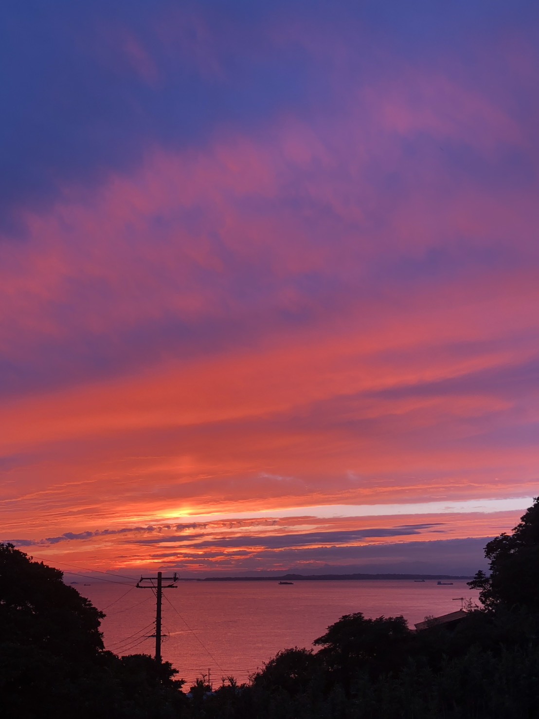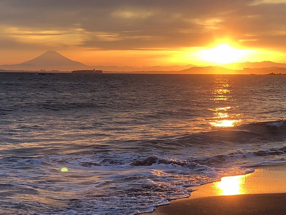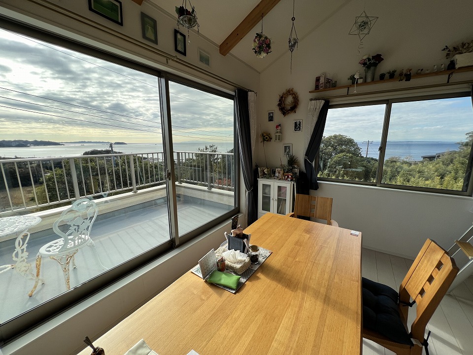 今回ご紹介させていただく物件は、風光明媚な海岸線から少し高台にあがった、海辺とは少し異なる空気感に包まれた住まいとなります。物件への道のりは慣れない方にとってはやや狭く感じるかもしれませんが、現地に着きそこからのロケーションを肌で感じてしまえば、そうした印象も吹き飛んでしまうほどの絶景が広がっている場所。海と緑の絶妙な景観のバランス感。その先に浮かぶ小さな島。さらに遠くには伊豆大島を望み、その光景の中を大小さまざまな船が東京湾を行き交う情景——。夕刻には幻想的な夕陽が空と海を赤く染め上げ、夜には月道が海面に現れる——。そして空を見上げれば、満天の星空が夜空いっぱいに煌めきます。