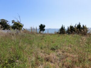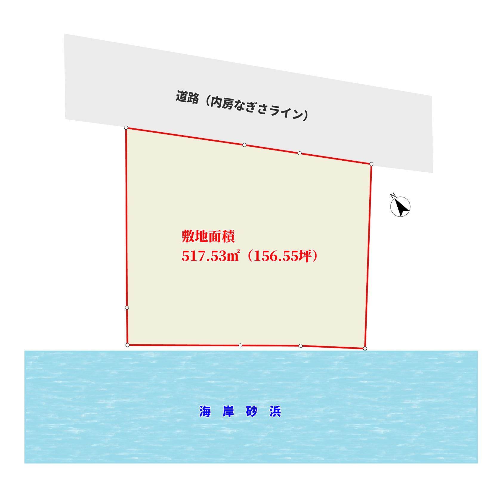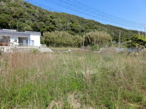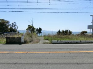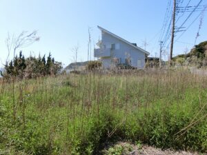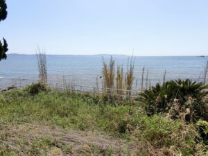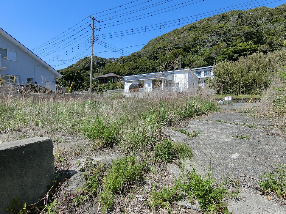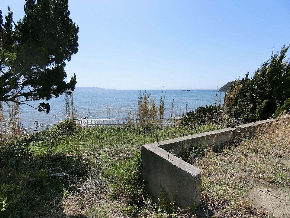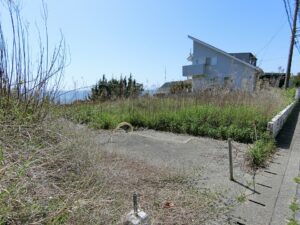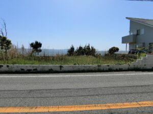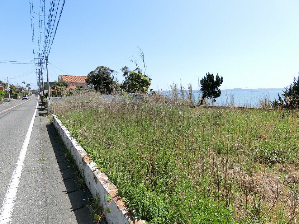 海岸に向かって間口の広い敷地は156坪というゆとりあるスケール感。先にご説明したとおり、海側には眺望を遮るものが一切なく、目の前に海一色の景色が広がる、まさに“海最前列”という言葉がふさわしい特等席である。現況は、古いブロック塀があり雑草も放置され見映えはしないかもしれませんが、きれいに片づけ整地をすることで、本来のポテンシャルが引き出され、見違えるような開放感ある海ある土地へと生まれ変わることは間違いありません。
