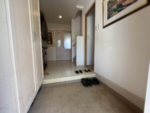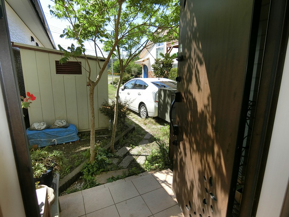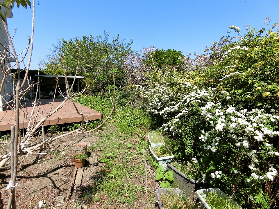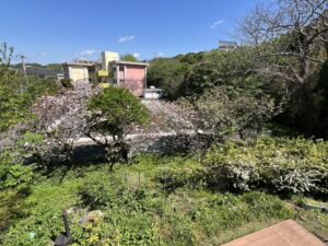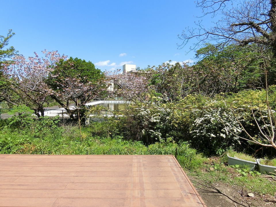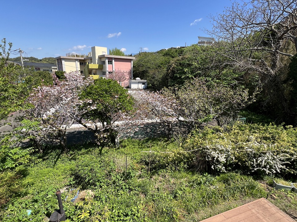物件の敷地は、東側へと延びる115坪の旗竿地。一見すると個性的な地型ではあるが、その先に隣接する土地は、数本のソメイヨシノと八重ザクラを隔てて西岬小学校のプールとなっているため、一年を通してほとんど人の気配を感じることはない、いわば“プライベートガーデン”のような空間が保たれている。また現オーナーさまのご趣味でもある草木の花々(ナニワイバラやモッコウバラ、コテマリなど)が程よく目隠しとなり、人の目線を感じることなく自由気ままに時間を過ごすことも可能です。
